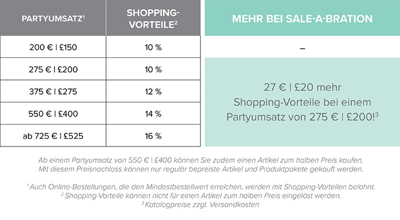 Für je 60 € Einkaufswert erhhaltet ihr ein Sale-A-Bration GRATIS-Produkt. Neu ist diesmal, dass es 2 Produkte gibt die etwas größer bzw. wertvoller sind und ihr diese für die doppelte Prämie von € 120 aussuchen könnt. Diese Produkte sind extra gekennzeichnet (orange).