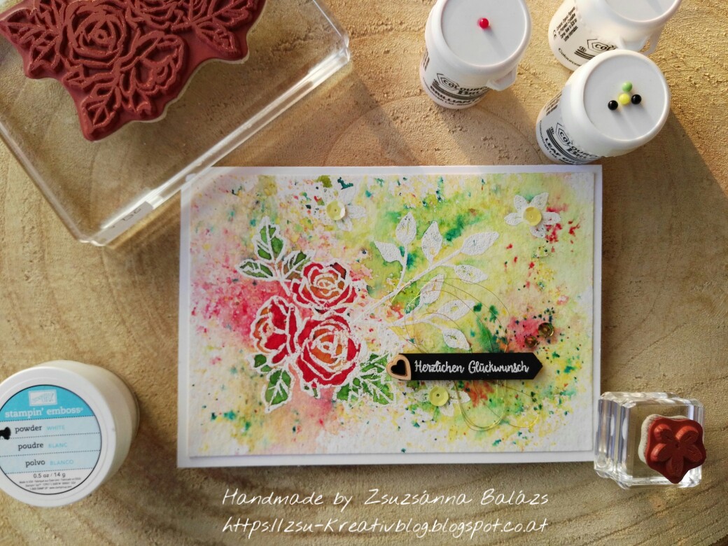 Und danach kamen die Brushos ins Spiel. Das Brusho habe auf das Papier gestreut, mit Wasser besprüht und so entstand der tolle Hintergrund.