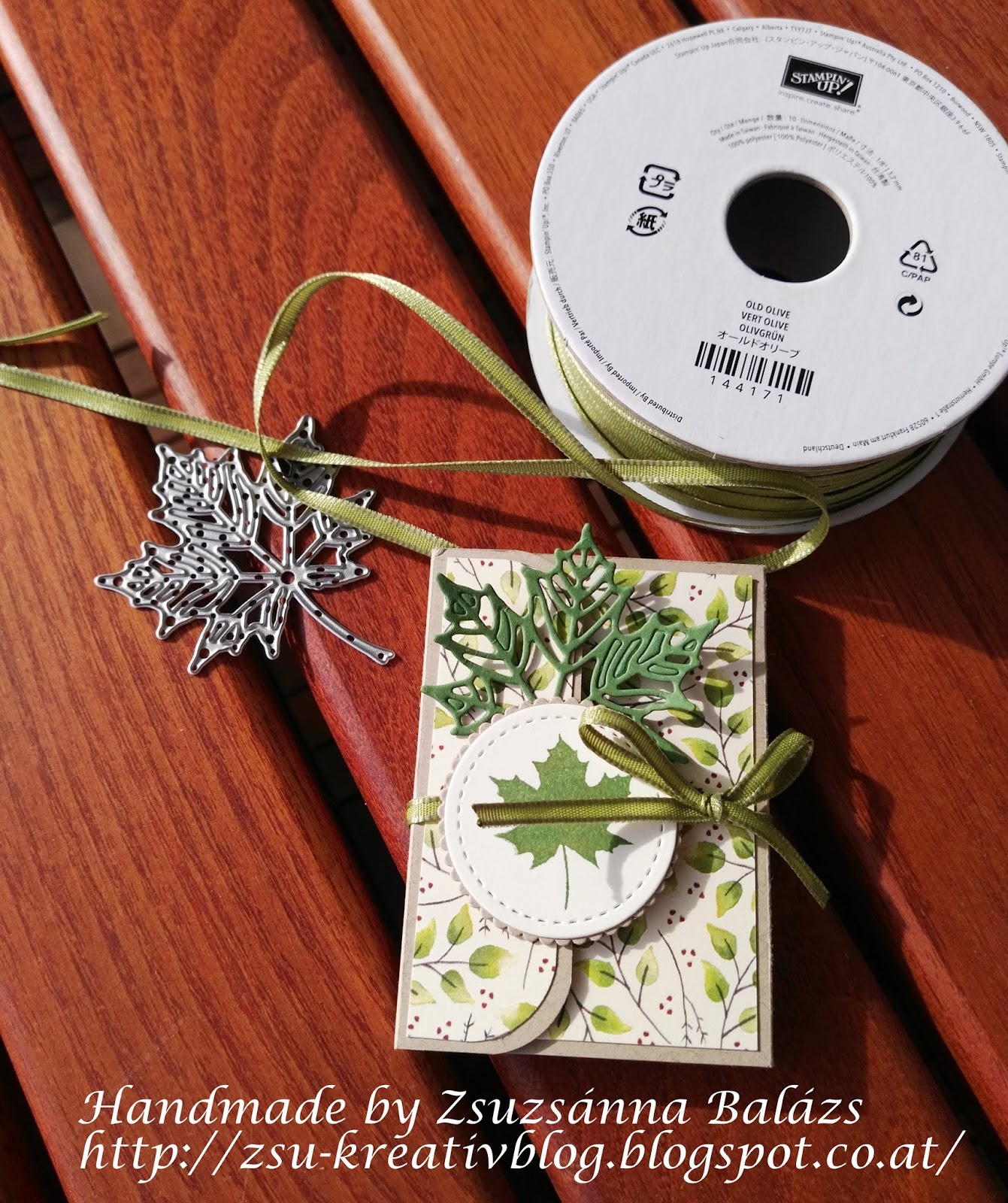 Das Grundgerüst ist der Farbe „Savanne“, geschmückt mit einem wunderschönen Designpapier „Herbstimpressionen“ aus dem Herbst-/Winterkatalog 2017. Das Minialbum wird zwar mit einem Magneten verschlossen, habe aber trotzdem ein Band in Olivengrün rundherum gewickelt, weil es einfach schöner ist 🙂 Das gestempelte Blatt und das ausgestanzte Blatt stammt vom Produktpaket „Jahr voller Farben“. Diese Produktpaket kann ich euch wirklich ans Herz legen, denn es ist so vielseitig einsetzbar 🙂