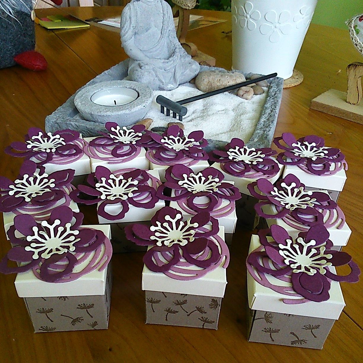 Die Boxen habe ich wieder in meinen Lieblingsfarben Taupe, Vanille Pur, Himberrot und Zarte Pflaume gestaltet.