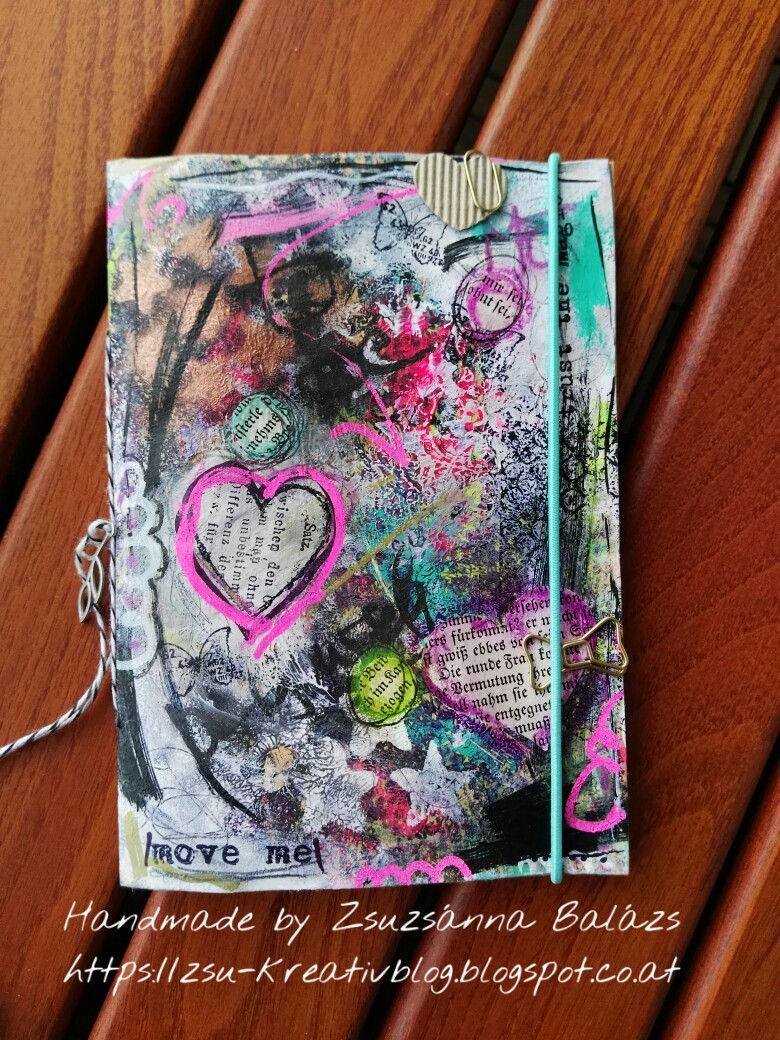 So entstand diese Mini-Album aus braunen Versandtaschen. Das Cover habe sowohl AuĂźen als auch Innen im Mixed Media Art Stil gestaltet. Unter anderem habe ich eine Gelli Plate verwendet, viel Acrylfarbe, Stanzteile aus einem alten Buch gemacht, Acrylstifte etc.