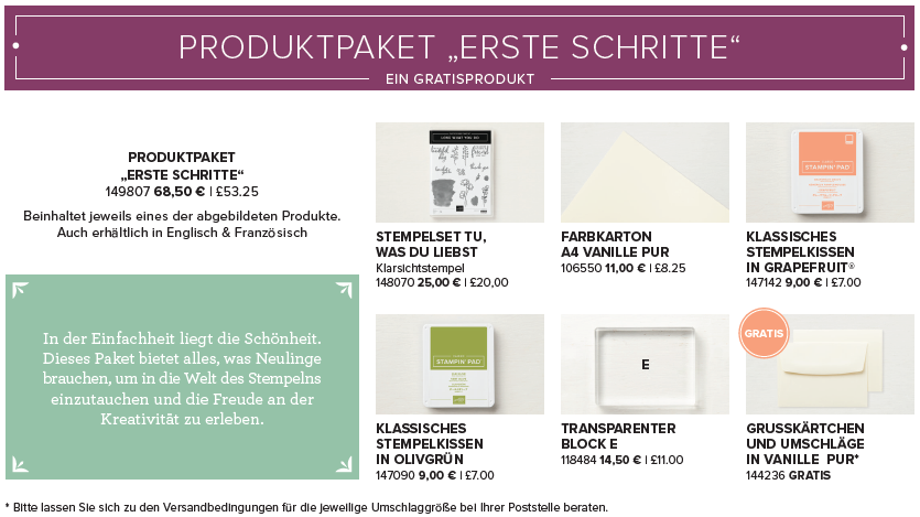 Dieses Paket ist fĂĽr alle, die Stampin‘ Up! verfallen sind oder verfallen möchen 🙂 Mit den Produkten aus diesem Set habt ihr vielseitige Möglichkeiten um tolle Projekte zu gestalten 🙂