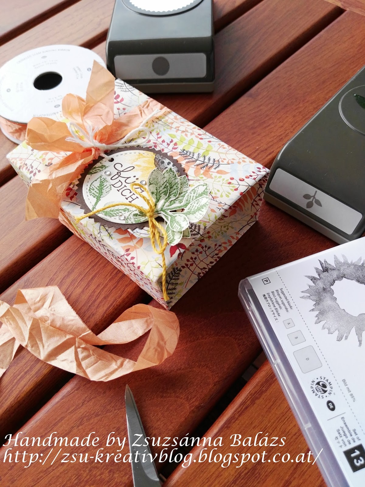 Für meine Schachtel habe ich ein Designpapier aus dem Set „Herbstimpressionen“ in 12 x 12″ verwendet. Dieses tolle Designpapier findet ihr im neuen Herbst-/Wingerkatalog 2017 welches ab 1.9.2017 für euch erhältlich ist 🙂