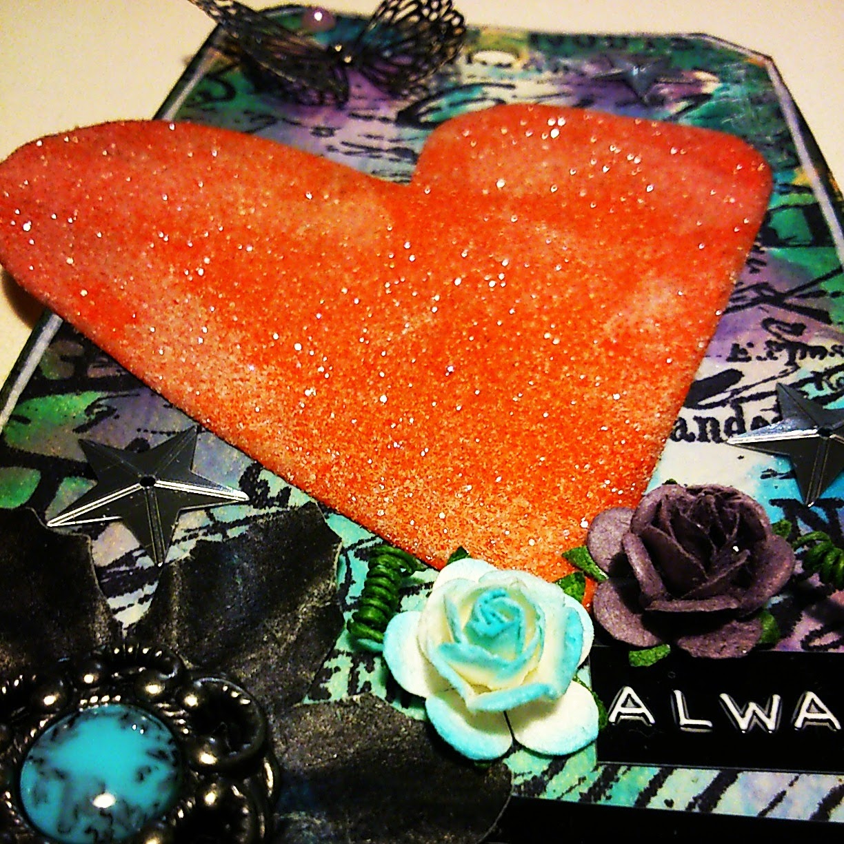 Das Herz hab ich mit einem Sizzix Stanzer gestanzt, mit roter Acrylfarbe eingefärbt. Danach kam noch Sticky Embossingpulver drauf und zum Schluss dann Distress Glitter Rock Candy.