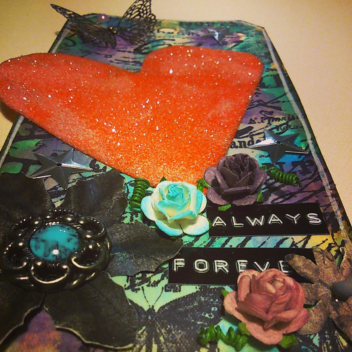 Das Herz hab ich mit einem Sizzix Stanzer gestanzt, mit roter Acrylfarbe eingefärbt. Danach kam noch Sticky Embossingpulver drauf und zum Schluss dann Distress Glitter Rock Candy.