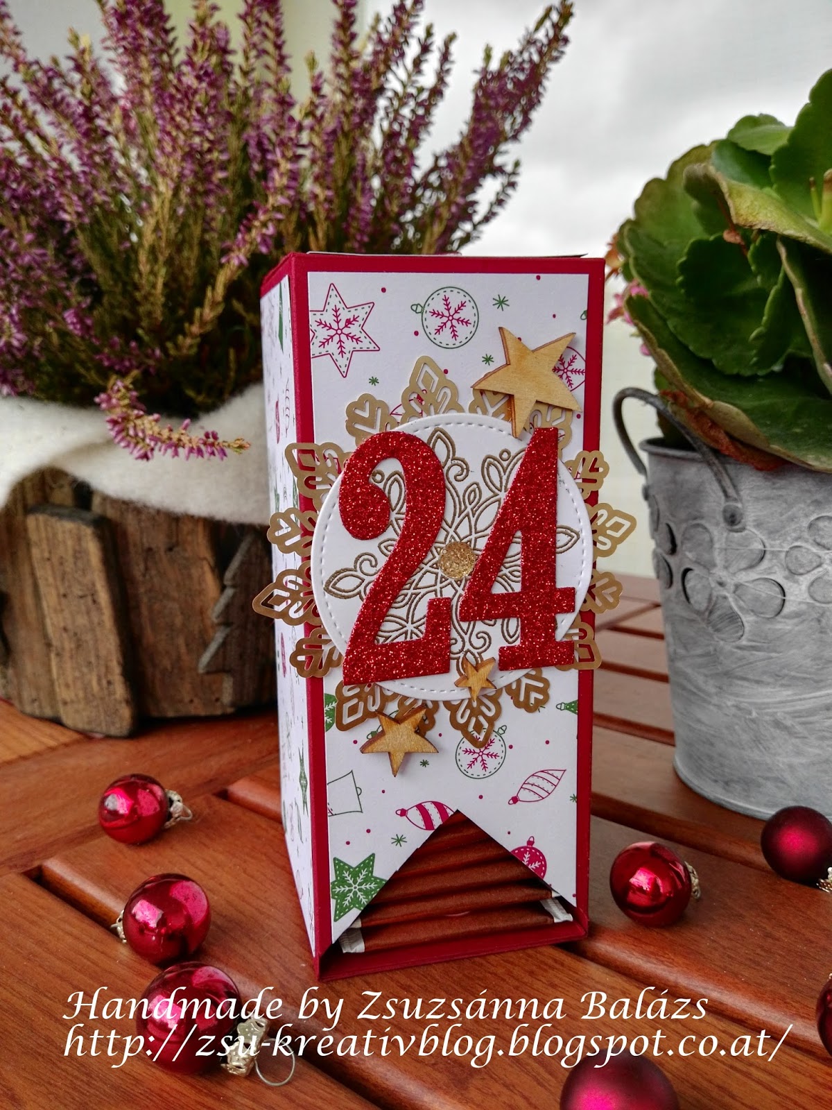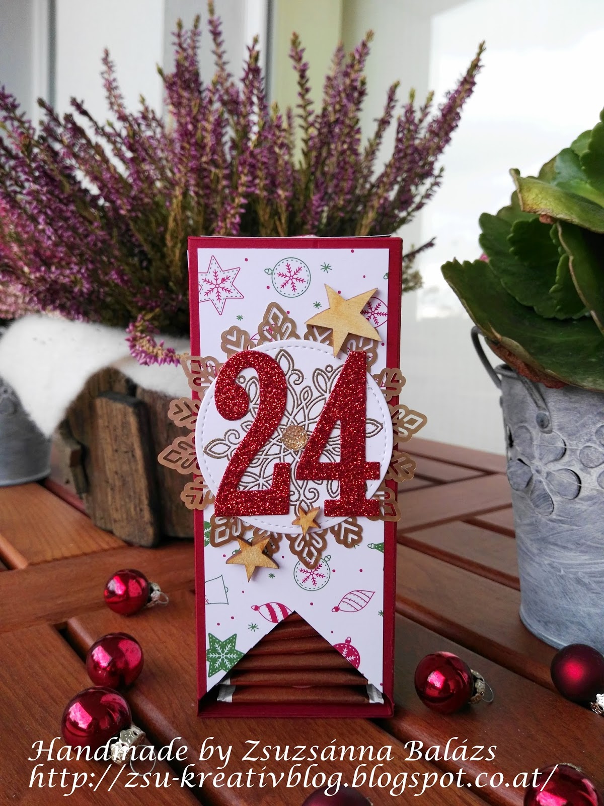 Verwendet habe ich dafĂĽr CS in Chilirot und das umwerfende Designpapier „Voller Vorfreude“. Die Ziffern habe ich mit den Framelits „GroĂźe Zahlen“ in Glitzerrotem Papier ausgestanzt.