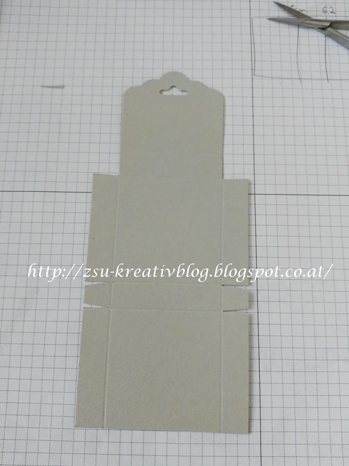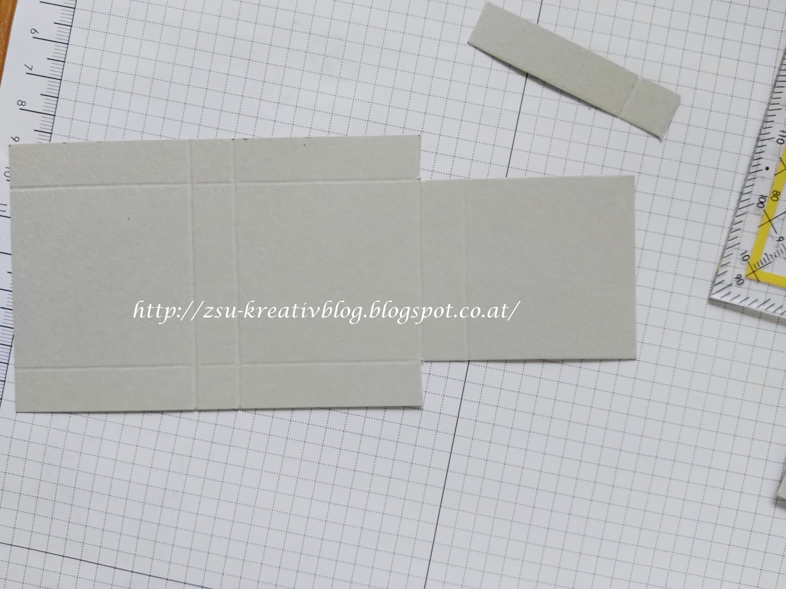 Wir benötigen einen Cardstock in der Größe 7,4 cm x 17 cm. Gefalzt wird auf der kurzen Seite bei 1,2 cm (rechts u. links) und auf der langen Seite bi 5 cm und bei 6,2 cm (von links nach rechts) und bei 4,6 cm und 5,8 cm (von rechts nach links).