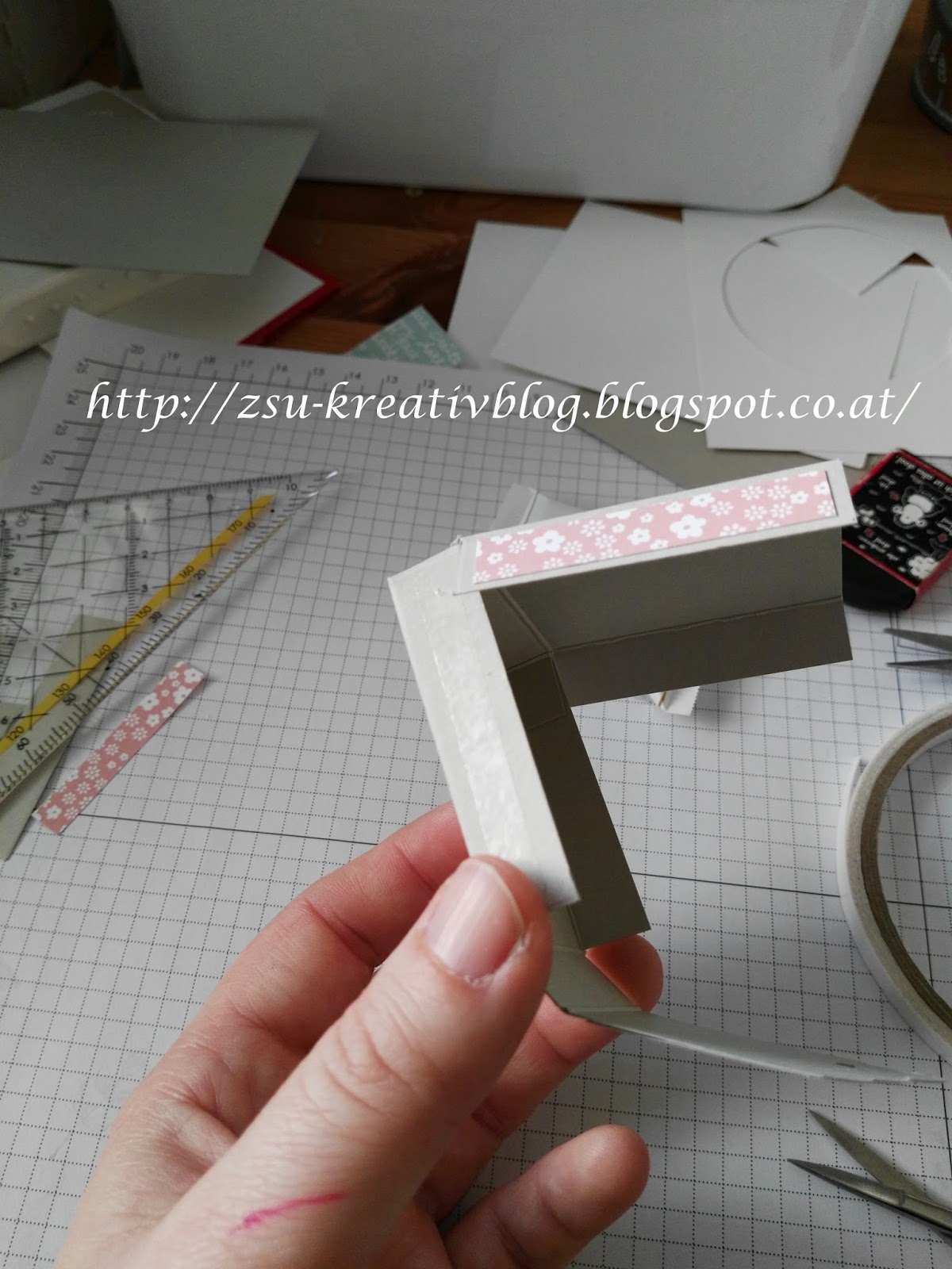 Danach wird die lange, die mit dem Designpapier beklebte Lasche angeklebt: