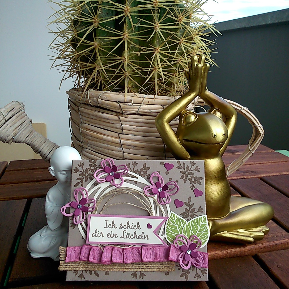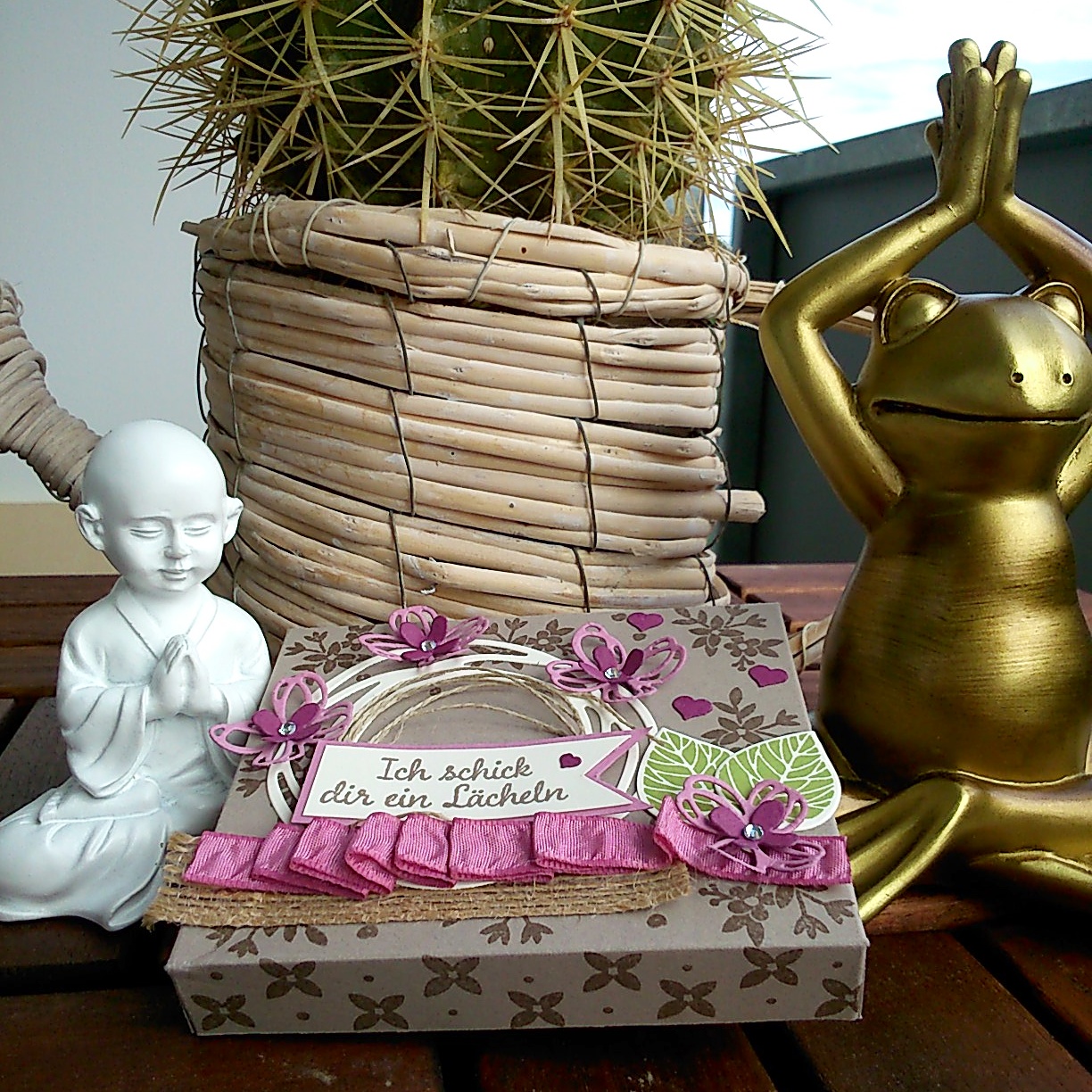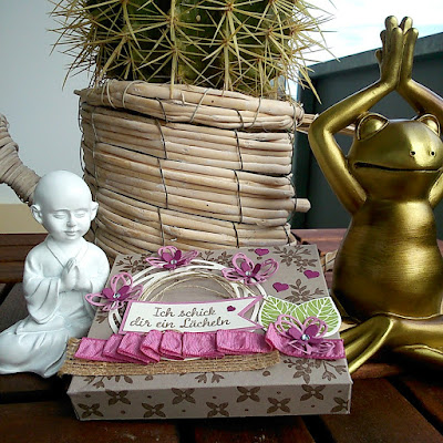 Die Schachtel habe ich in meiner derzeit Lieblingsfarbkombitnation Taupe, Vanille Pur, Himbeerrot und zarte Pflaume gestaltet.