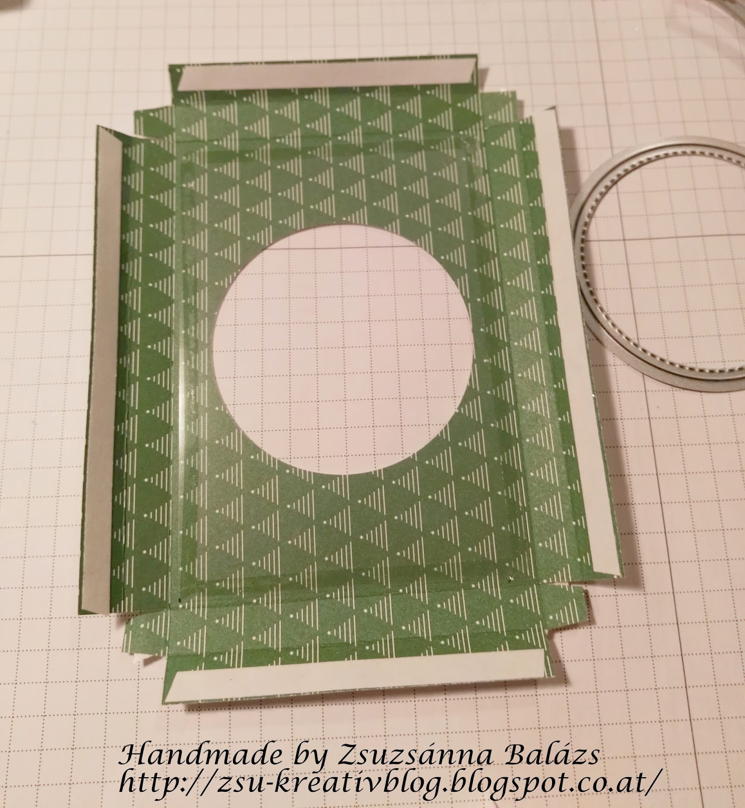 In der Mitte stanzt ihr einen Loch aus, ich habe die 2. größte Stickdreien Thinlit genommen. Auf der Innenseite klebt ihr dann eine Klarsichtfolie darauf.